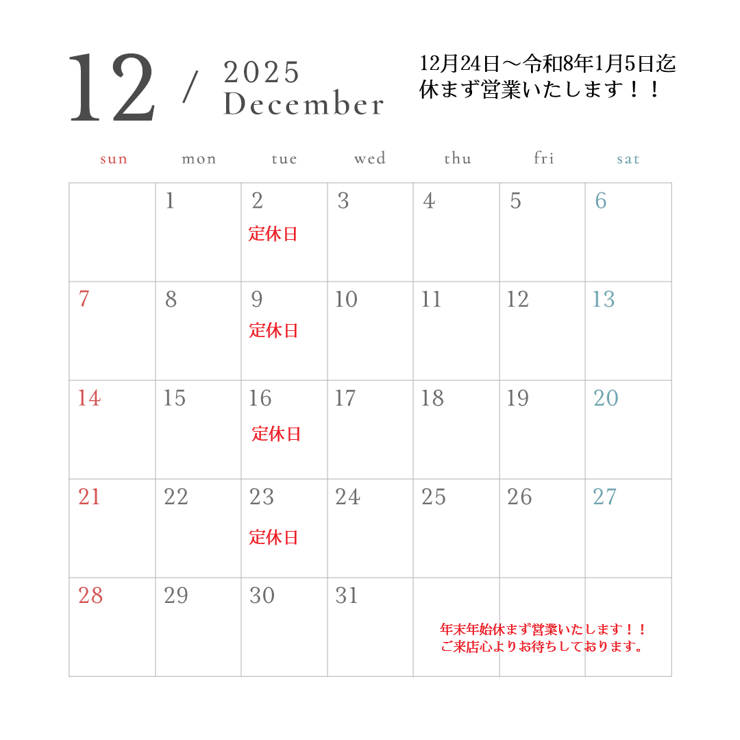 12月24日~令和8年1月5日迄休まず営業いたします!!
